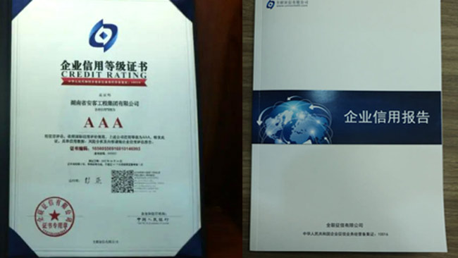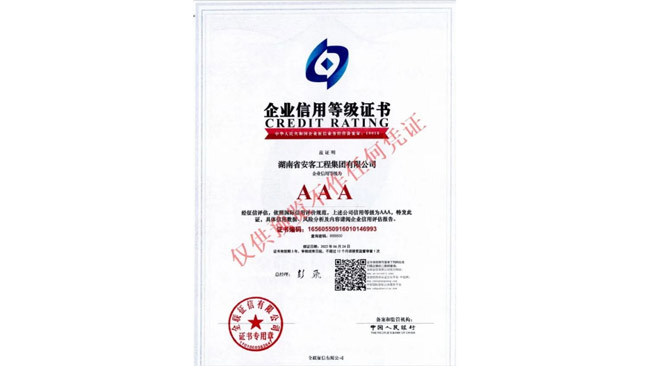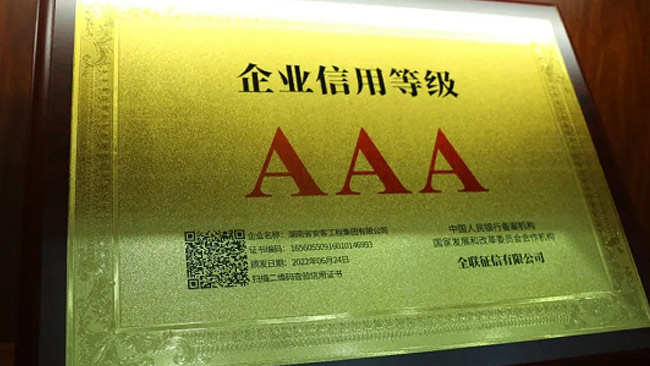 在今年的全國征信評定活動中,湖南省安客工程集團有限公司又一次脫穎而出,再度榮冠成為2022年度“企業(yè)信用等級3A”企業(yè),為集團品質品牌升級邁向新的高度,凝聚更多力量,注入更多動能。